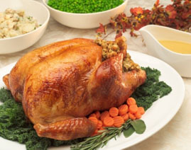 Présentez la dinde entourée de garnitures (pommes de terre, champignons, marrons...) et de farce avec la sauce à part.